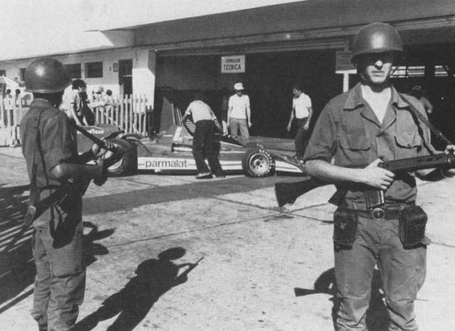 La Argentina volvió a tener Grand Prix en 1977 y lo mantuvo hasta 1981, en plena dictadura militar. Mirá la foto (publicada en el excelente blog de Flavio Gomes, el periodista brasileño al que tantas veces vimos en los GGPP de F-1). Está tomada en ocasión del GP de 1978, en el patio de boxes del Autódromo, y lo que ves como recinto de revisión técnica hoy es la Sala de Prensa del “Oscar y Juan Gálvez”: ¡los baños son los mismos desde hace 33 años! Al Brabham BT48C del campeón del mundo Niki Lauda lo custodian dos conscriptos con metralletas. ¿A vos te parece tranquilizador? ¡Horrible!