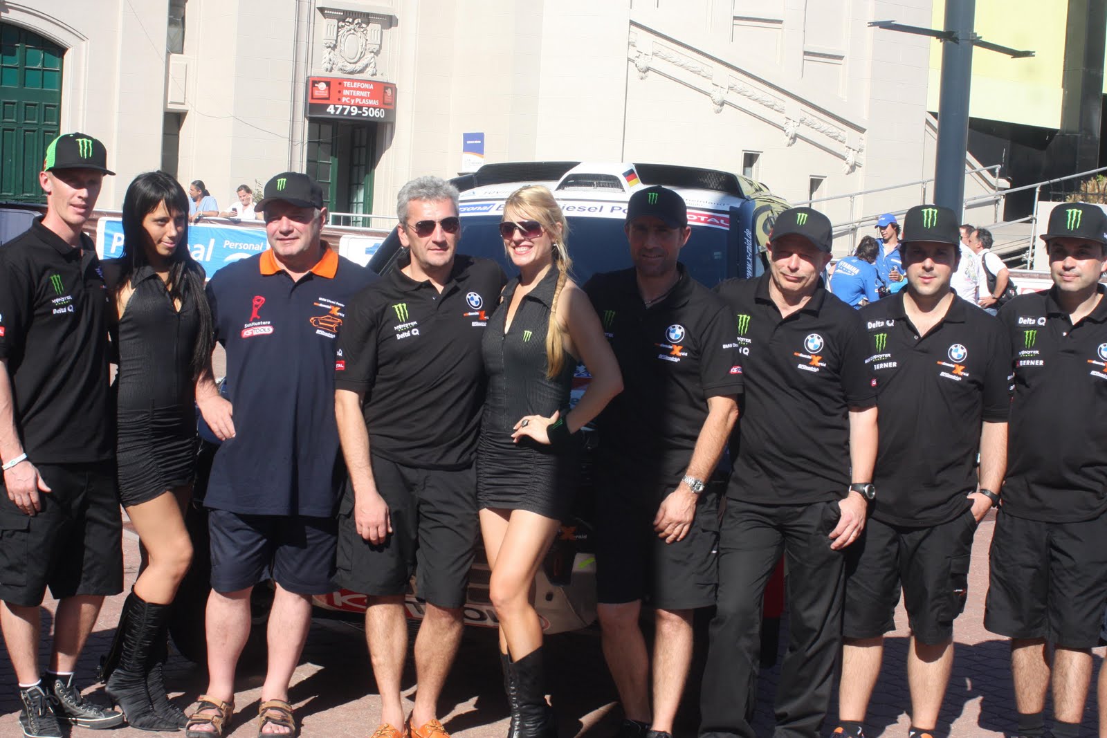 Parte del equipo BMW en La Rural, falta Orly; y para que te sirva de referencia, a la izquierda de la rubia que está lista para afrontar el Dakar se corra donde se corriera (lo mismo que la morocha), uno de los proceres del Dakar, Peterhansel (Foto Prensa Total)