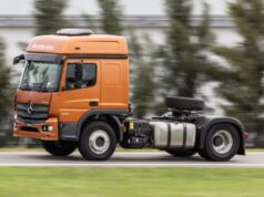 El Mercedes Benz Atego 2430, automatizado, 6×2 balancín, con motor BlueTec Euro V, también requiere la utilización BlueDEF®. Equipado con una caja de barandas volcables puede transportar entre 13 y 14 contendores de 1000 litros de urea automotriz por viaje.