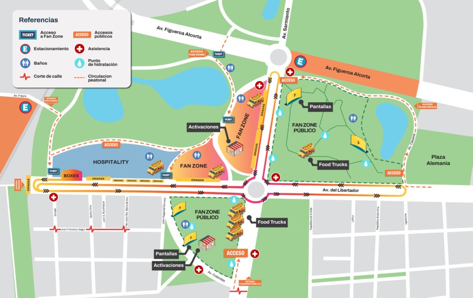 Anotá: tenés fan zones, pantallas gigantes, escenarios, souvenirs.