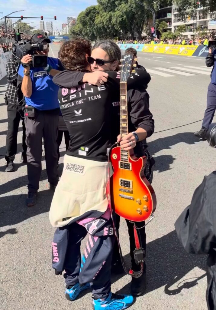El abrazo de Franco con Gastón Sardelli, el guitarrista de Airbag, que elaboró una fabulosa ejecución del Himno Nacional Argentino.