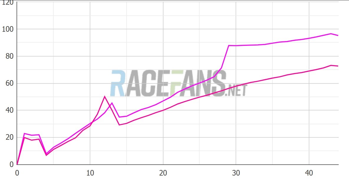Después de su segunda detención, Colapinto giró siempre más veloz que Gasly, como indica el gráfico inferior.