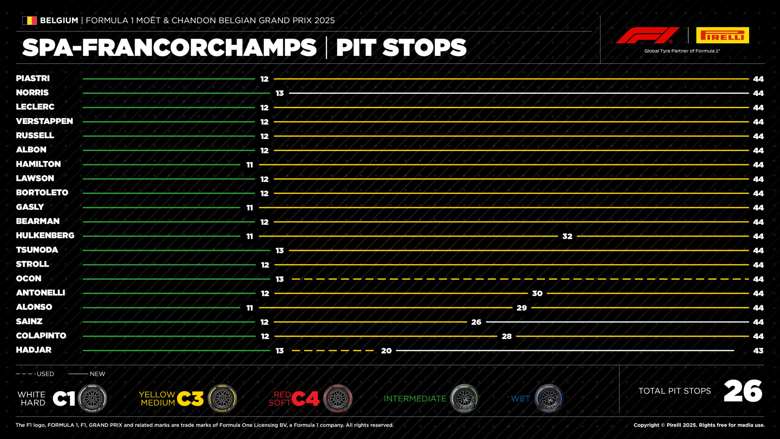 Hasta la segunda detención de Colapinto, Gasly le llevaba al argentino unos 7 segundos. Teniendo en cuenta la extensión de la calle de boxes de Spa, las paradas son largas: esa detención le consumió a Colapinto unos 23 segundos y medio adicionales. La diferencia llegó a ser de medio minuto.