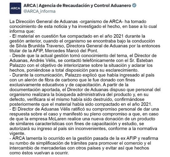 El posteo de ARCA en su cuenta en X, ratificó lo sucedido.