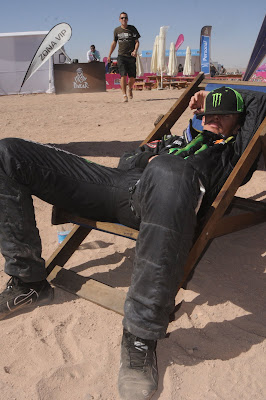 Cualquier lugar es bueno para recuperarse, para descansar aunque sea un rato o como en el caso de Guerlain Chicherit del Mini Cooper Contryman (9ª en la general de Autos) , una de las grandes novedades de la carrera. El francés no lo dudó ni un instante, se sentó en la hamaca y se durmió una flor de siesta en pleno vivac en el desierto, si bien con sol y calor, el cansancio pudo mas.