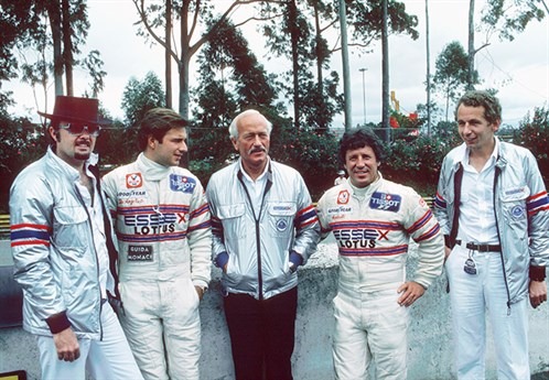 Al lado de una de ellas, como haciéndose el gil, está sentado Colin Chapman, el creador de la casa Lotus, el responsable de haber creado ese coche relativamente convencional. Justo detrás suyo, el presidente de la Federación Internacional del Automóvil (FIA), el local Jean Marie Balestre, le habla al oído a Bernie Ecclestone, el titular de la Asociación de Constructores de Fórmula 1 (FOCA), justo unos meses antes de que estallara la guerra entre las instituciones que representaban.