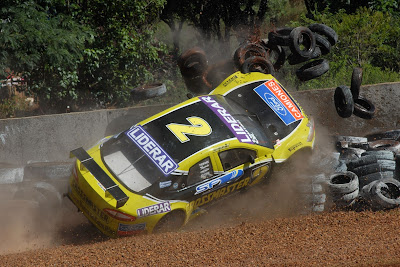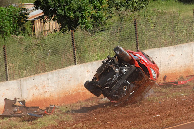 El auto rojo, terminó sus volteretas y quedó muy roto, el piloto sin problemas