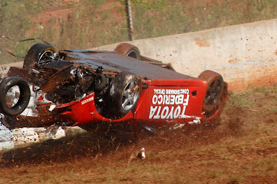 El auto rojo, terminó sus volteretas y quedó muy roto, el piloto sin problemas