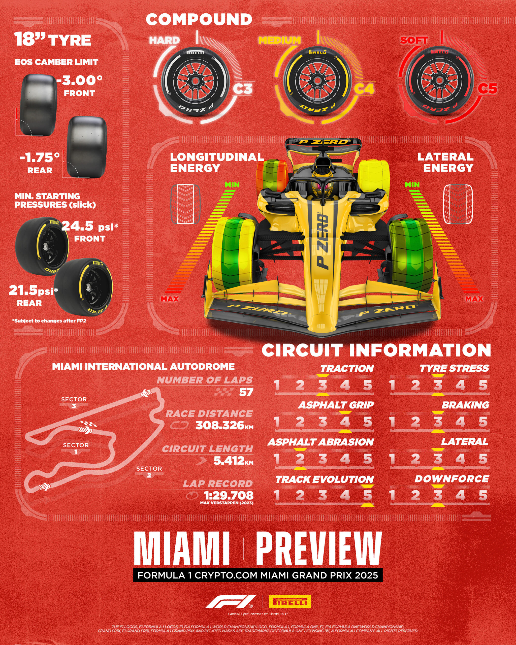 Pirelli ha seleccionado para este fin de semana los compuestos más blandos de su gama: C3 (duro), C4 (medio) y C5 (blando). Esta elección busca fomentar estrategias variadas y aumentar la emoción en carrera.