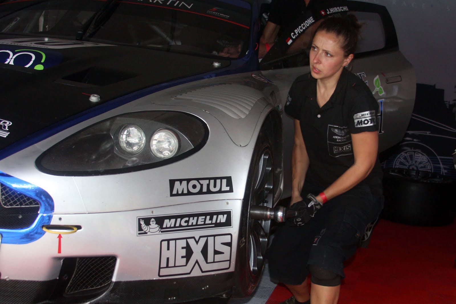 Mirala bien: se llama Elise Bauquel, tiene 27 años y nació en Nimes (Francia), dónde tiene su sede el equipo Hexis, que pone en pista dos Aston Martin DB9 en el Mundial de Gran Turismo. “Disfruto mucho viajar, y el trabajo no es tan duro” señala. ¿Cuál es su labor en la escuadra francesa? Es mecánica. “No soy la única, hay otra chica que cumple la misma tarea en el equipo Vitaphone Maserati” señala Elise. Menudita, trabaja a la par de sus compañeros, y no le escatima el cuerpo a la reacción física.