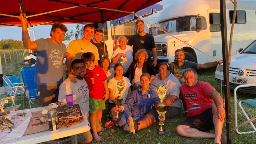 La chica junto a su padre, madre, familiares y unos integrantes del equipo, en un día de festejos. Mucho esfuerzo en tiempos difíciles en el país y amor del bueno por el automovilismo.