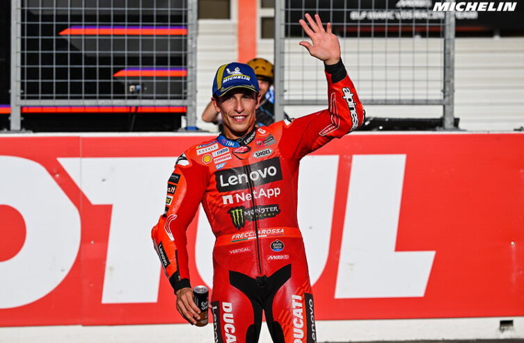 Esta cercanía con un nuevo título, no ha elevado esta vez la ansiedad de Marc por conquistarlo a pura victoria. Conocedor que más temprano que tarde llegará, Marc ha tomado una posición más tranquila como se vio en el Sprint japones donde no opuso mucha resistencia al dominio de Pecco Bagnaia su compañero de Ducati. No tenía sentido, porque el segundo lugar por encima de su hermano Alex, reforzó sus chances al objetivo mayor y de paso para darle al italiano el aliciente anímico en una temporada en la que fue permanentemente superado por Márquez.
