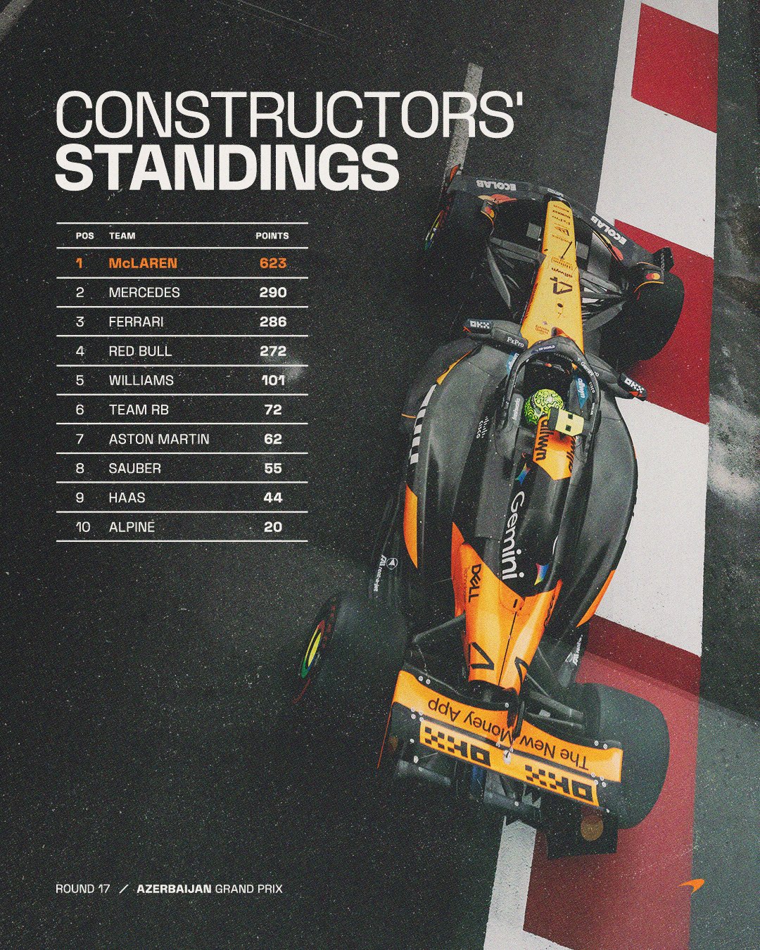 En el fin de semana en el que McLaren tenía la primera chance de ganar el título de Constructores, en Azerbaiján, sus pilotos recogieron la peor cosecha de puntos de todo el campeonato. Piastri volvió a mostrar esas raras pero inevitables lagunas que lo acometen cada tanto. Resultado: la primera competencia en 35 en la que no sumó un solo punto.