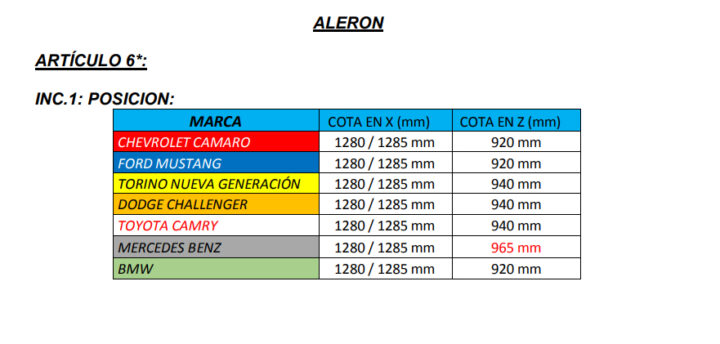 Las piezas del alerón provisto únicamente por FADRA (Fundación del Automovilismo Deportivo de la República Argentina) y repuestos no podrán alterarse. Para el Mercedes-Benz pasa de 940 a 965mm.