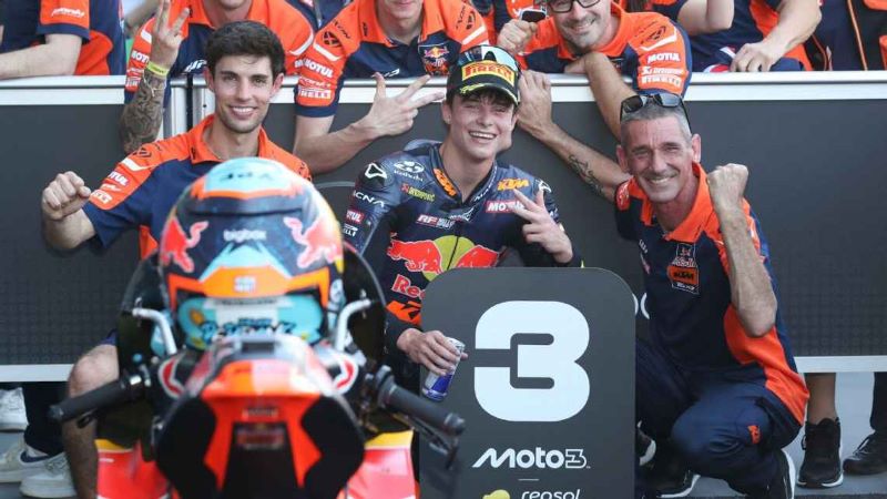 El argentino Valentín Perrone del equipo Tech3, tercero, completó un podio exclusivo de KTM, y lo hizo después de una brillante labor, considerando que el Coyote largó 14º y llegó tercero en el comienzo de su segunda temporada, encarada con la mira puesta en el campeonato. El fin de semana no había ido bien para el argentino, luego de la caída en la clasificación.
