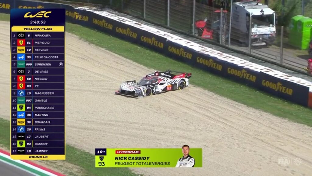 En el nº 93, el debutante Nick Cassidy las pasó feas: solo recorrió 500 metros desde su salida de boxes con las cubiertas muy frías hasta su despiste en la variante Tamburello (foto). Muy avergonzante. La grúa volvió a ponerlo en carrera, pero al cabo de las 6 horas perdió tres vueltas y quedó 16º y anteúltimo.