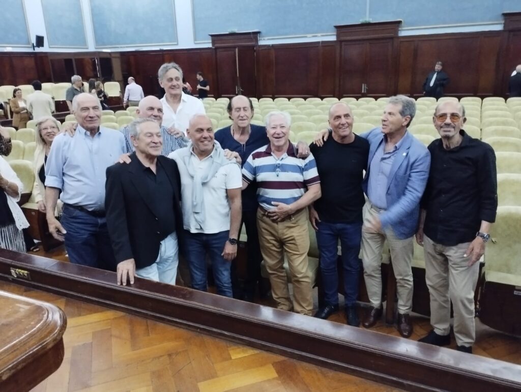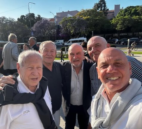 Para compartir el gran momento de Pronello (de izq a der): Toto Etchegaray, Pérez, Juan Carlos Giacchino, Pepe Fortunato, Der Ohanessian, Tito, Raúl Barceló., Rafael Verna, Croceri,