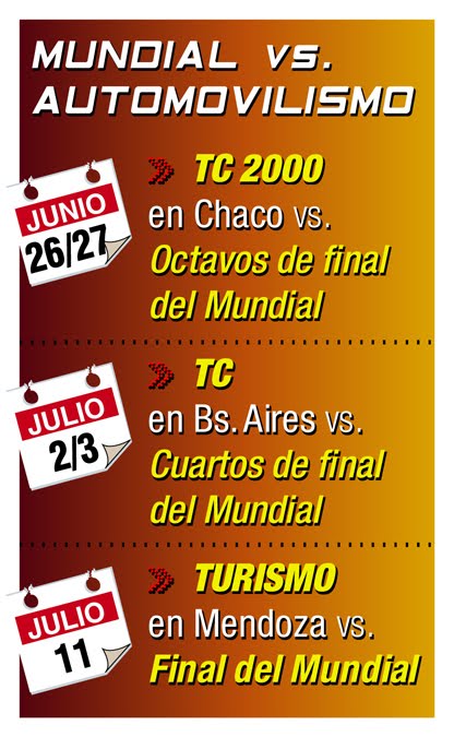 Paradójicamentes este silencio llegó en el fin de semana que menos podría haber sufrido el automovilismo la fiebre mundialista. ¿Por qué? Por la no coincidencia con los partidos de seleccionando argentino. Una coincidencia que ya padeció el TC en Posadas, que en una semana sufrirá el TC 2000 en Resistencia y que si los muchachos de Maradona siguen derecho en su camino a la ansiada final puede afectar en los siguientes fines de semana, y cada vez con mayor intensidad, nuevamente al TC y al Turismo Nacional.
