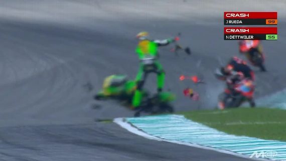 ¿Quién podía imaginar que en la vuelta de presentación de la carrera que iniciaba la programación en el circuito de Sepang, iba desatarse el drama que dejó malheridos a dos pilotos. Casi nadie, pero pasó, cuando lanzada a toda velocidad, eb la zona que conduce a la Curva 4,i la KTM del español José Antonio Rueda, consagrado anticipadamente campeón mundial, se encontró de golpe con la Honda del suizo Noah Dettwiller que circulaba a mucha menor velocidad. Una situación que se dio entre cierta distracción de Rueda al mirar el tablero de su moto y el lento andar del suizo por una falla mecánica en su moto.