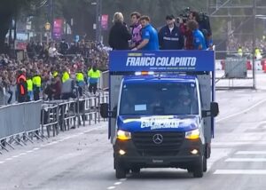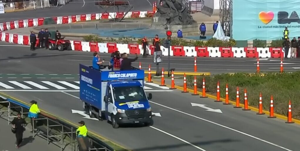 Franco Colapinto recorrió las avenidas del Libertador y Sarmiento a bordo de una Sprinter Chasis especialmente acondicionada para la ocasión, con un espacio elevado que le permitió acercarse a la gente y recibir de cerca el afecto del público.